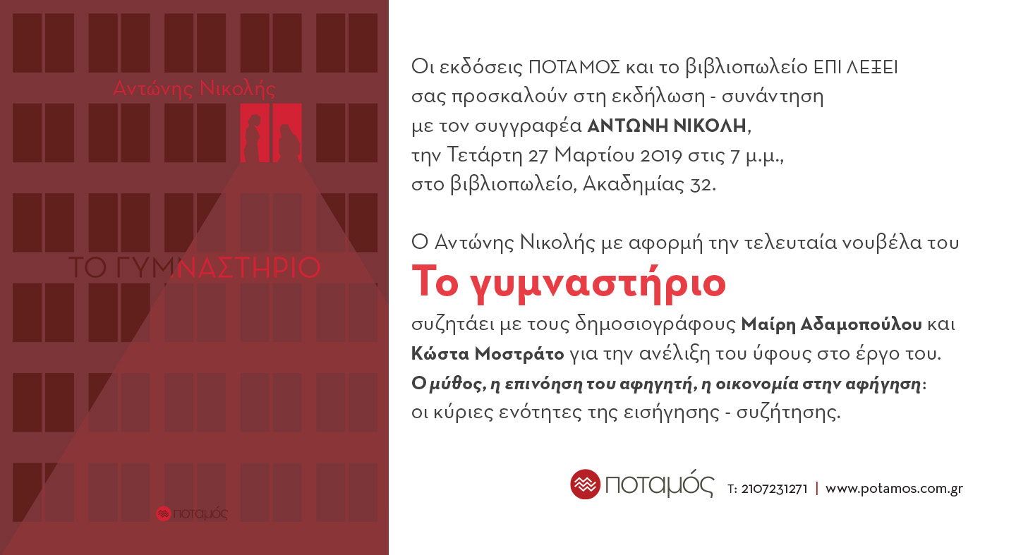 Οι εκδόσεις Ποταμός και το βιβλιοπωλείο Επί λέξει σάς προσκαλούν στη εκδήλωση - συνάντηση με τον συγγραφέα Αντώνη Νικολή, την Τετάρτη 27 Μαρτίου 2019, στις 7 μ.μ.
